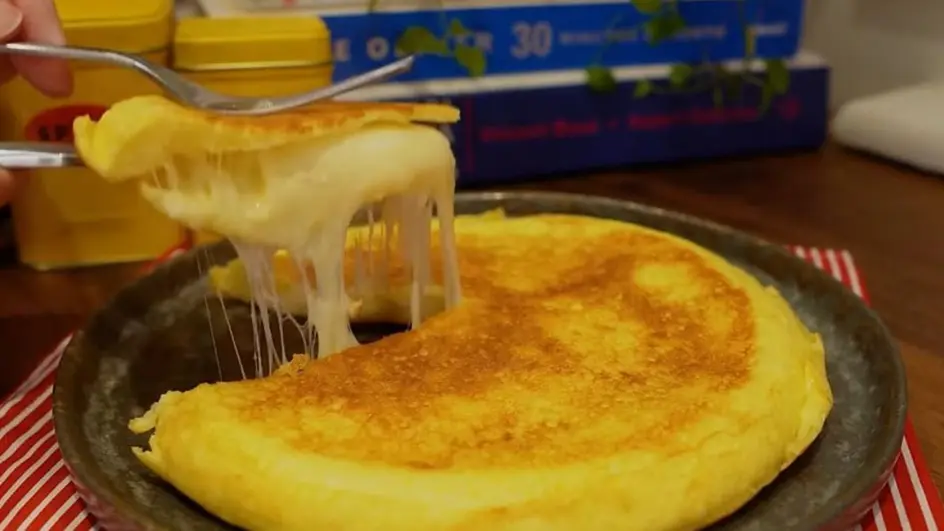 Acrescente as fatias de queijo sobre a massa e despeje o restante da massa por cima para formar um recheio. Tampe novamente e cozinhe em fogo baixo por mais três a quatro minutos, até que o fundo esteja dourado.